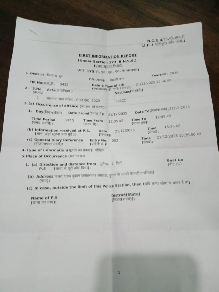 भिलाई। हाउसिंग बोर्ड क्षेत्र, वार्ड क्रमांक 25 में कचरा भट्टी (गारबेज फर्नेस या डंपिंग पॉइंट) के पास से एक प्लंबर की लाल रंग की हीरो होंडा पैशन प्रो मोटरसाइकिल (रजिस्ट्रेशन नंबर CG04 DV 2508) अज्ञात चोर द्वारा चोरी कर ली गई। यह घटना CCTV फुटेज में कैद हो गई है, और पीड़ित ने वैशाली नगर चौकी/थाने में शिकायत दर्ज कराई है। पुलिस ने चोरी का मामला दर्ज कर लिया है, और जांच जारी है।