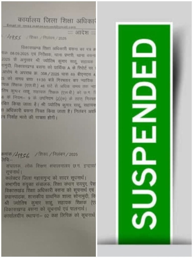निलंबन अवधि में उनका मुख्यालय विकासखंड शिक्षा अधिकारी, बसना तय किया गया है तथा उन्हें केवल जीवन निर्वाह भत्ता ही मिलेगा। शिक्षा विभाग की इस सख्त कार्रवाई से जिलेभर में हड़कंप मच गया है।