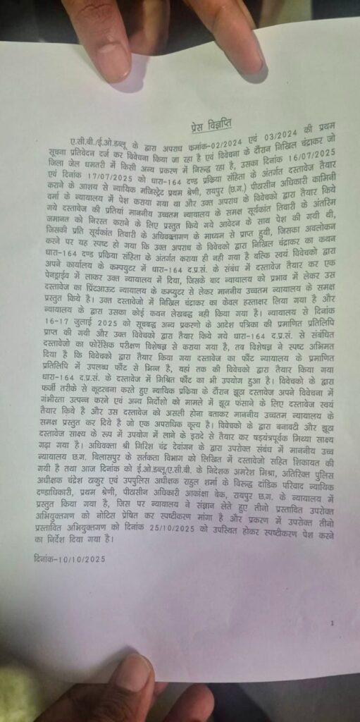 मामला अपराध क्रमांक 02/2024 एवं 03/2024 से जुड़ा हुआ है, जिसमें निखिल चंद्राकर नामक व्यक्ति से संबंधित धारा 164 दंड प्रक्रिया संहिता के अंतर्गत कथन दर्ज करने में भारी गड़बड़ी पाई गई।जांच में यह खुलासा हुआ कि विवेचकों ने निखिल चंद्राकर का कथन न्यायालय में दर्ज कराने के बजाय अपने कार्यालय में कंप्यूटर पर फर्जी दस्तावेज तैयार कर, उसे पेनड्राइव के माध्यम से न्यायालय में प्रस्तुत किया। इस बनावटी दस्तावेज़ पर केवल हस्ताक्षर करवाए गए — जबकि न्यायालय में उसका वास्तविक बयान दर्ज ही नहीं किया गया था!