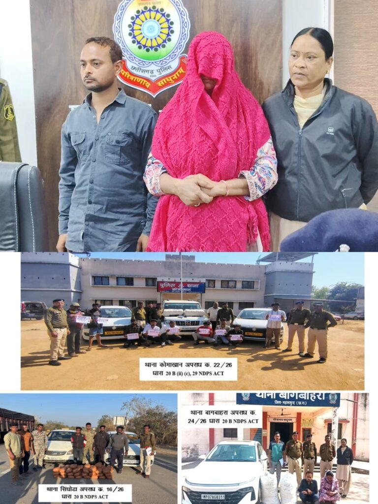 थाना सिंघोड़ा क्षेत्र में दो कारों से 52.5 किलो गांजा जब्त कर तीन आरोपियों को गिरफ्तार किया गया। थाना कोमाखान में बोलेरो और दो स्वीफ्ट डिजायर कारों से 40 किलो गांजा बरामद कर छह आरोपियों को पकड़ा गया, जिनमें गांजा मंगाने वाला और पायलट वाहन चालक भी शामिल हैं। वहीं थाना बागबाहरा क्षेत्र में हुंडई वेरना कार से 40 किलो गांजा जब्त कर दो आरोपियों को गिरफ्तार किया गया।