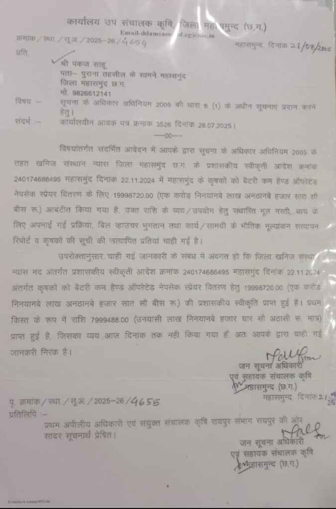 महासमुंद। जिला खनिज न्यास (DMF) फंड से किसानों को बैटरी एवं हैंड ऑपरेटेड नेपसैक स्प्रेयर देने के नाम पर खुला खेल चल रहा है। 22 नवंबर 2024 को स्वीकृत 1.99 करोड़ रुपए (कुल 1,99,98,720 रुपए) में से पहली किस्त के 80 लाख रुपए कृषि विभाग के खाते में आए एक पूरा साल बीत गया, लेकिन एक भी स्प्रेयर किसानों तक नहीं पहुंचा। पूर्व पार्षद पंकज साहू ने कृषि विभाग के अधिकारियों व स्थानीय जनप्रतिनिधियों पर सीधा आरोप लगाया है कि “कमीशन का मोटा खेल और बैंक में पड़े पैसे का ब्याज हड़पने के लिए जान-बूझकर वितरण रोका जा रहा है।” पंकज साहू ने बताया कि DMF से आई राशि पिछले एक साल से कृषि विभाग के खाते में पड़ी है। इतनी बड़ी राशि पर मिलने वाला ब्याज की रकम लाखों में है। उनका सवाल है – “यह ब्याज कौन खा रहा है? किसान तो आज भी बाजार से 8-10 हजार रुपए खर्च कर स्प्रेयर खरीदने को मजबूर हैं।