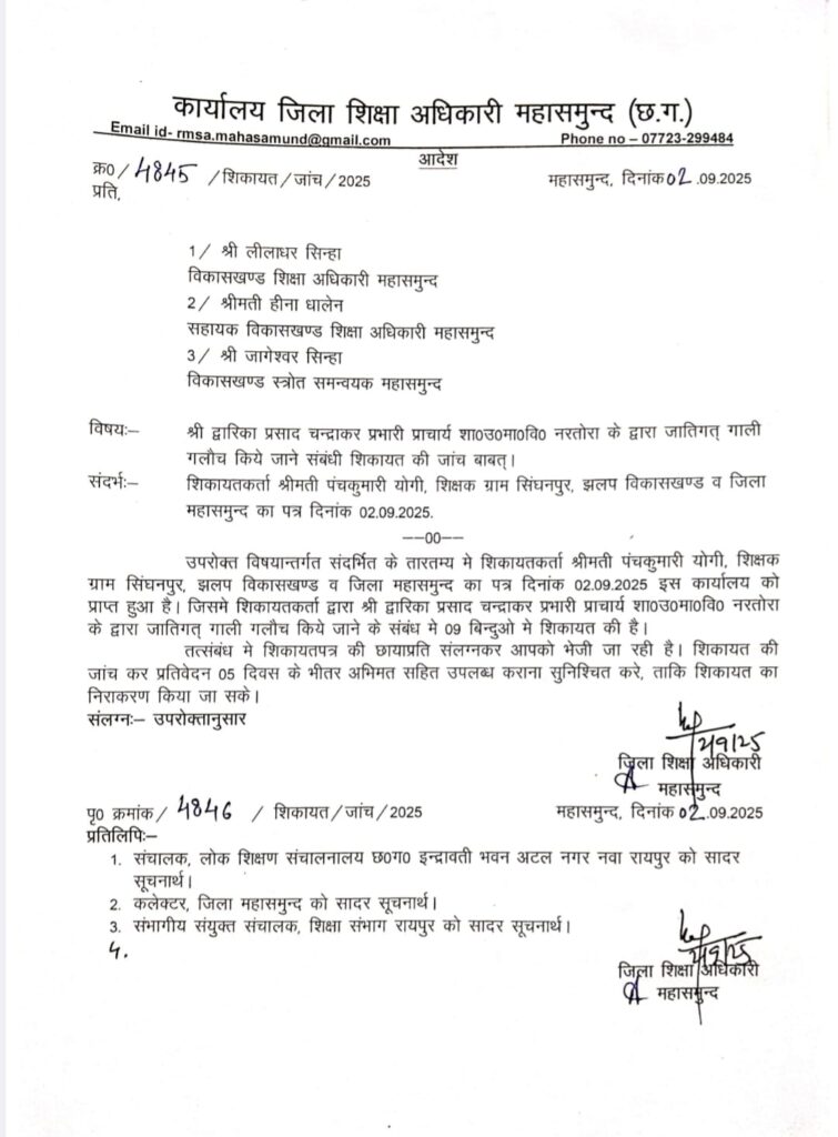 महासमुंद। जिले में शिक्षा विभाग से जुड़े एक गंभीर मामले में जिला शिक्षा अधिकारी ने जांच के आदेश जारी किए हैं। ग्राम सिंघनपुर, झलप विकासखण्ड की शिक्षिका श्रीमती पंचकुमारी योगी ने आरोप लगाया है कि शासकीय उच्च माध्यमिक विद्यालय नरतोरा के प्रभारी प्राचार्य द्वारिका प्रसाद चन्द्राकर ने उनके साथ जातिसूचक गाली-गलौज की है।
