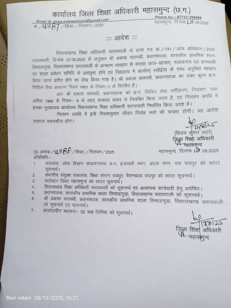 आदेश जिला शिक्षा अधिकारी महासमुंद विजय कुमार लहरे के हस्ताक्षर से 13 अगस्त 2025 को जारी हुआ। यह कार्रवाई शिक्षा विभाग की ओर से अनुशासनहीनता और कर्तव्य में लापरवाही पर ‘जीरो टॉलरेंस’ की नीति का उदाहरण है। विभाग ने स्पष्ट संदेश दिया है कि विद्यार्थियों और समाज के साथ अनुचित व्यवहार, नियमों का उल्लंघन और जिम्मेदारियों से चूक करने वालों पर कड़ी कार्रवाई की जाएगी।