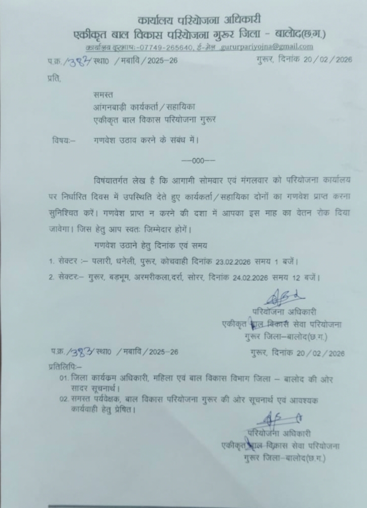 गुरूर (बालोद)। एकीकृत बाल विकास परियोजना गुरूर की परियोजना अधिकारी द्वारा जारी पत्र (प.क्र./39 स्था० /मबावि/2025-26, दिनांक 20/02/2026) ने आंगनबाड़ी कार्यकर्ताओं और सहायिकाओं में भारी रोष पैदा कर दिया है। पत्र में साफ कहा गया है कि सोमवार (23 फरवरी 2026) और मंगलवार (24 फरवरी 2026) को निर्धारित समय पर गणवेश (यूनिफॉर्म) प्राप्त न करने पर इस माह का वेतन रोक दिया जाएगा। कार्यकर्ता स्वयं इसके लिए जिम्मेदार होंगी।