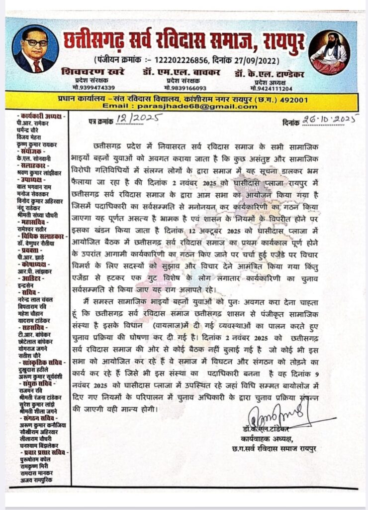 प्रदेश अध्यक्ष के एल टांडेकर ने जारी विज्ञप्ति में कहा गया है कि 12 अक्टूबर 2025 को घासीदास प्लाज़ा रायपुर में आयोजित बैठक में सर्व रविदास समाज के प्रथम कार्यकाल की अवधि पूर्ण होने के उपरांत, नई कार्यकारिणी के गठन पर विचार-विमर्श किया गया था। इस दौरान सदस्यों से सुझाव एवं विचार आमंत्रित किए गए थे, ताकि नियमानुसार आगामी कार्यकारिणी का गठन पारदर्शी रूप से किया जा सके।