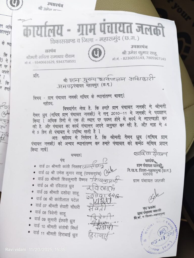 ग्रामीणों ने गंभीर आरोप लगाया है कि पिछले पंचवर्षीय कार्यकाल (2015-2020) में तत्कालीन सरपंच ने मनरेगा व अन्य योजनाओं के लाखों रुपये निकाल लिए थे, लेकिन विकास कार्य नहीं हुए। यह बात सचिव रीमन ध्रुव को अच्छी तरह पता थी, फिर भी उन्होंने प्रशासन को सूचना नहीं दी। मामला तब खुला जब जिला कलेक्टर ने संज्ञान लिया और अभी सप्ताह भर पहले ही पुराने कार्यकाल के बचे हुए सीमेंट रोड व अन्य कार्य कराए गए। वर्तमान सरपंच ने सचिव के रवैये से तंग आकर जनपद पंचायत सरायपाली के मुख्य कार्यपालन अधिकारी (CEO) से लिखित शिकायत की। लेकिन शिकायत के बाद तो सचिव महोदया ने ग्राम पंचायत जलकी आना ही बंद कर दिया। अब ग्रामीण पूरी तरह बेबस हैं।